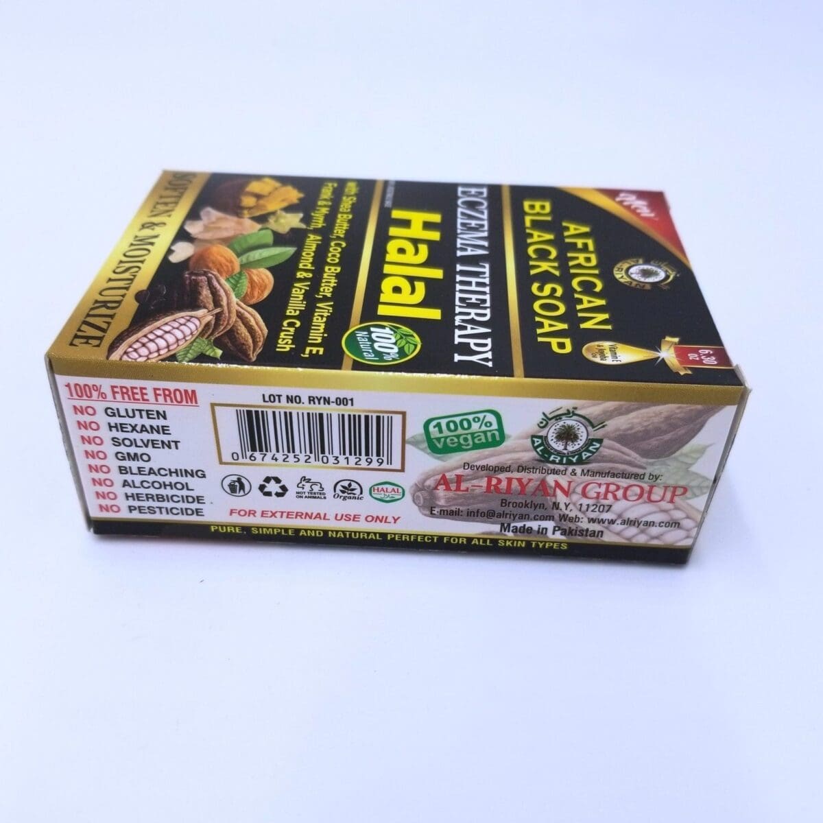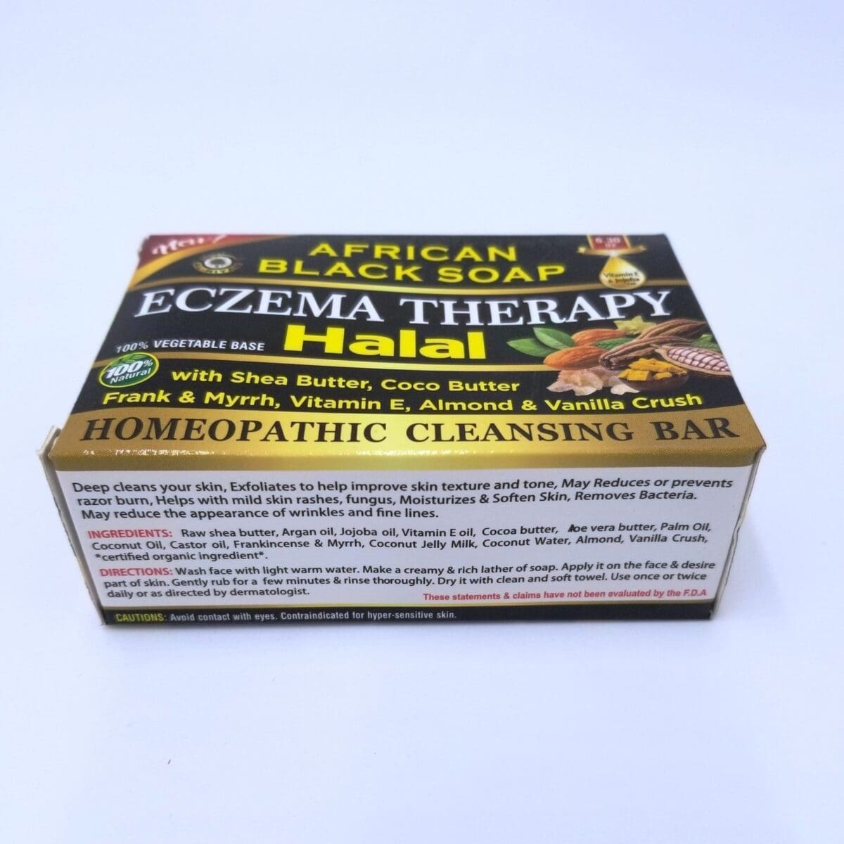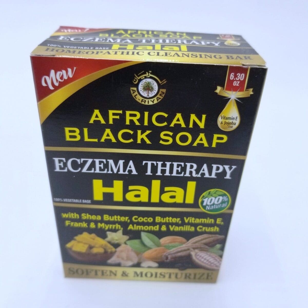 African Black Soap – Eczema Therapy Halal is a specialized skincare product designed to cater to individuals suffering from eczema while adhering to Halal standards. This soap is traditionally made using natural ingredients from West Africa, such as plantain skins, palm tree leaves, cocoa pod powder, and shea butter. The unique combination of these ingredients provides a gentle cleansing effect, helping to soothe and repair irritated skin without stripping it of its natural oils.